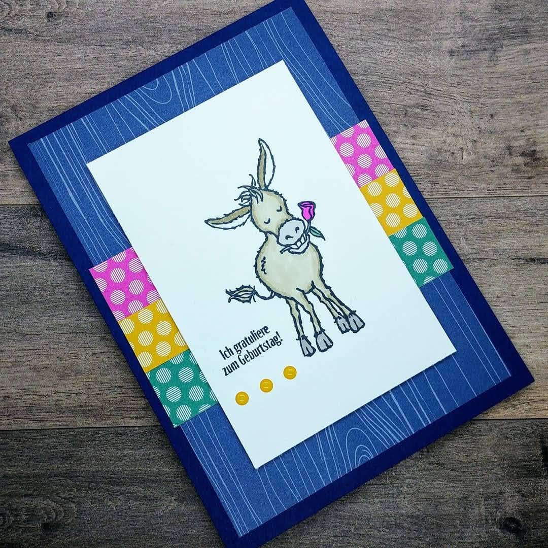 oh jeh, ich habe hier lange nichts mehr geschrieben. Im Dezember war ich mehr auf Instagram durch meine Challange vertreten. Es war so viel los und dank Ferien ist auch bei mir wieder etwas Ruhe eingekehrt. Ich freue mich jedes Jahr aufs Neue, wenn es wieder heißt: SAB = SaleAbration Zeit! Und in diesem Jahr haben wir die SAB geteilt und können uns zweimal im Jahr auf Geschenke freuen? Ist das nicht super??? Du kennst noch nicht die SAB und hast auch noch keinen Katalog und Flyer? Dann melde dich bei mir. Ich schicke dir gerne einen zu. Pro 60Euro Bestellung erhälst du ein Stempelset oder DSP=DesignerPapier GRATIS aus dem SAB Flyer. ( Natürlich solange der Vorrat reicht) Durch meine Vororder konnte ich schon ein paar Stempelsets ausprobieren und heute möchte ich euch das Stempelset „Grüsse auf vier Hufen vorstellen“ aus dem SAB Flyer vorstellen. Das ist so süß! Ganz schnell kannst du damit eine einfache Geburtstagskarte zaubern: