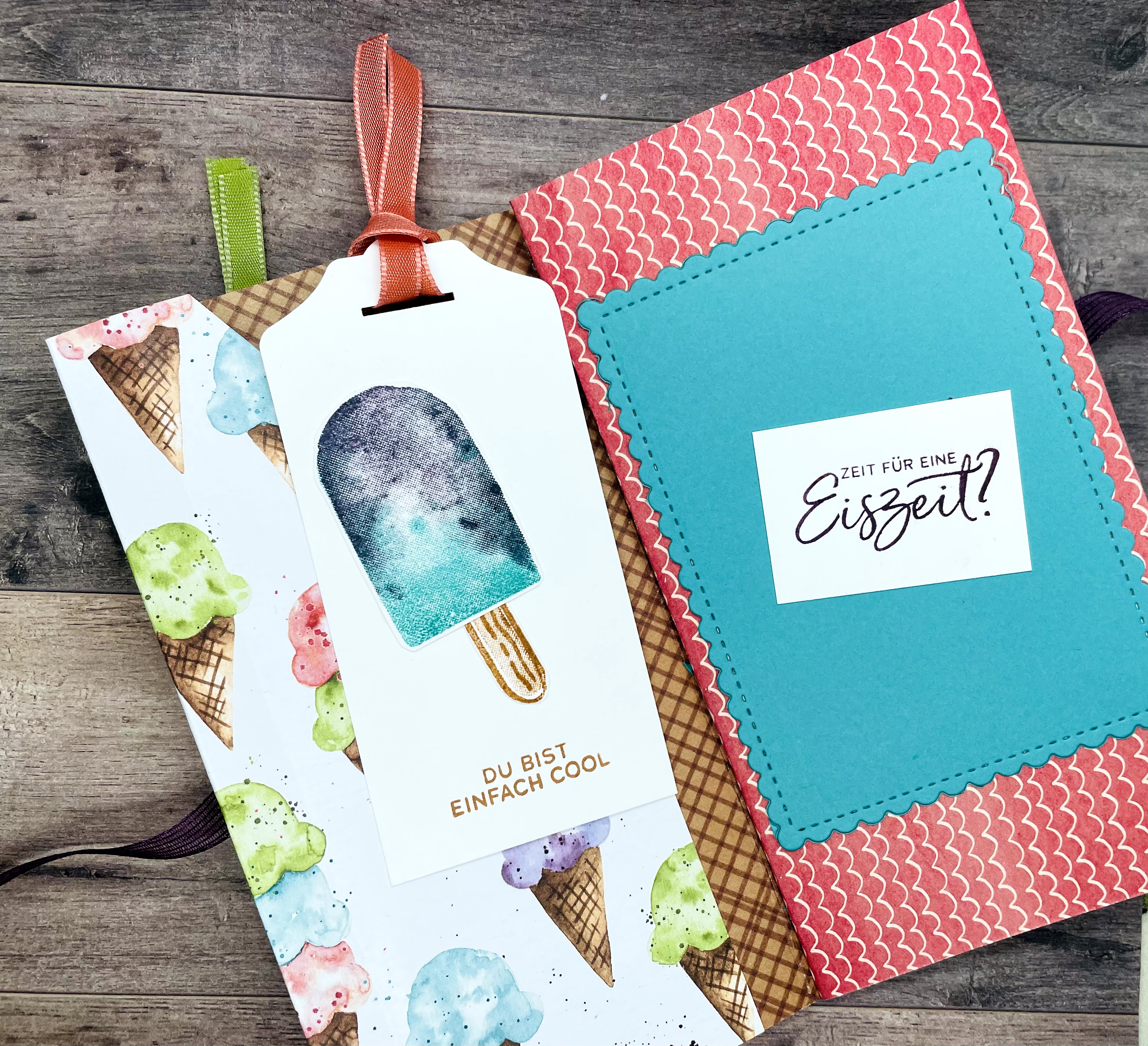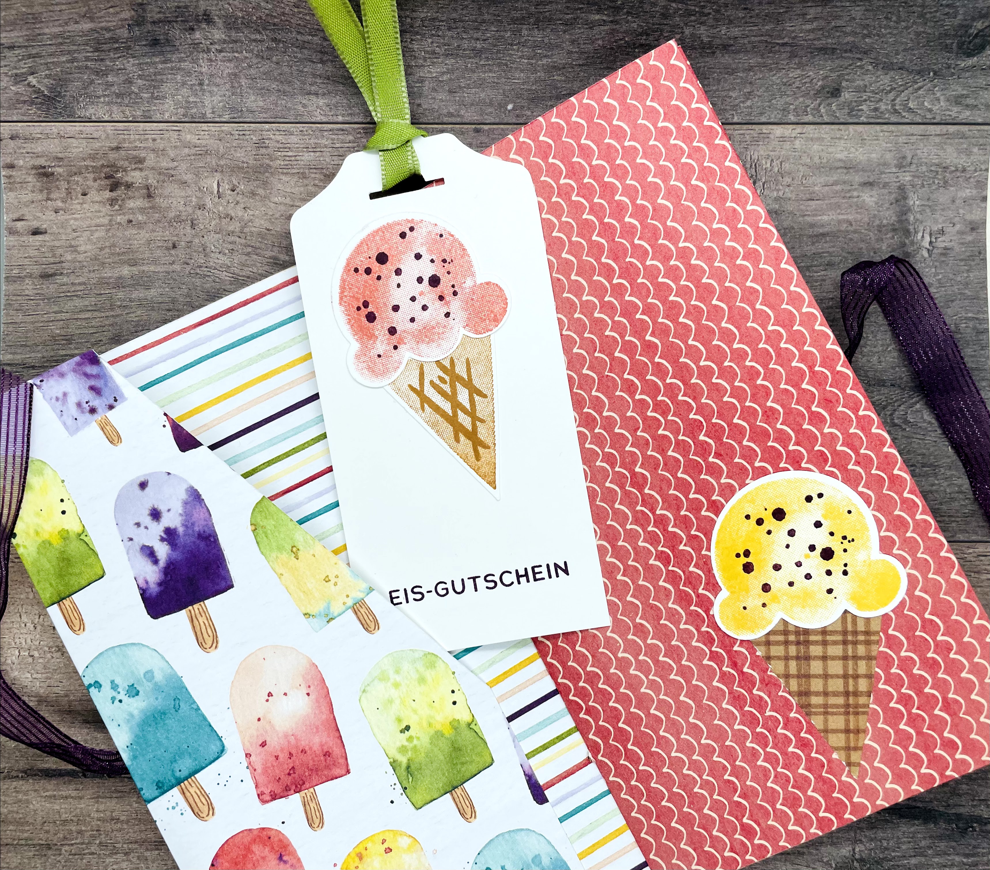 Hallo meine lieben Kreativfreunde, in meinem heutigen Instagram-Live habe ich euch gezeigt wie ihr ganz schnell eine Gutscheinkarte oder ein Mini Album basteln könnt. Natürlich habe ich bei diesem schönen Wetter die Produktreihe „Eisdiele“ ausgewählt – keinen Frage, oder? Schaut mal: