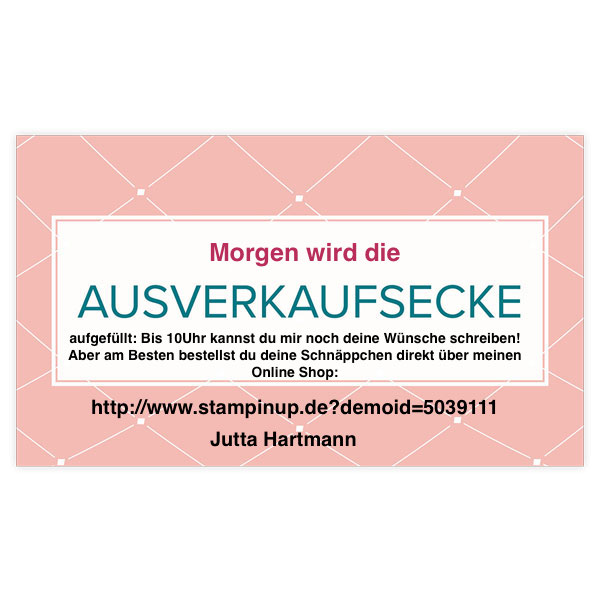 Hallo meine lieben Kreativfreunde, am 13.4. wird die Ausverkaufsecke aufgefüllt!!! Bis 10Uhr könnt ihr bei mir eure Bestellung schicken, dann packe ich die noch in die zusätzliche Paper Pumpkin Sammelbestellung. Aber wenn ihr auf Nummer sicher gehen wollt, dann müsst ihr schnell selber über meinen Online Shop bestellen: http://www.stampinup.de?demoid=5039111 Ich bin schon so gespannt, was da aufgefüllt wird und fiebere mit euch!