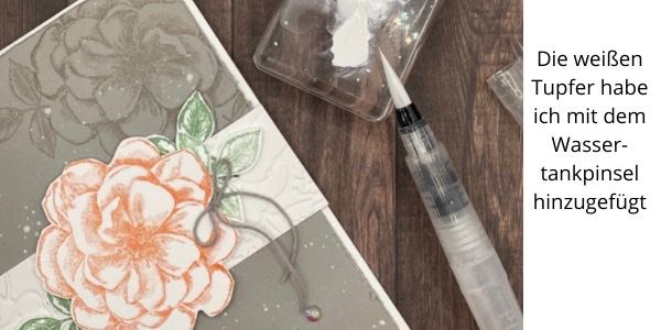 Die Rosen habe ich auf den Kartenaufleger und Schachtel Ton auf Ton in Granit gestempelt und die Spritzer mit weißer Nachfülltinte in Flüsterweiß. Eine einfache Technik mit tollen Effekt.