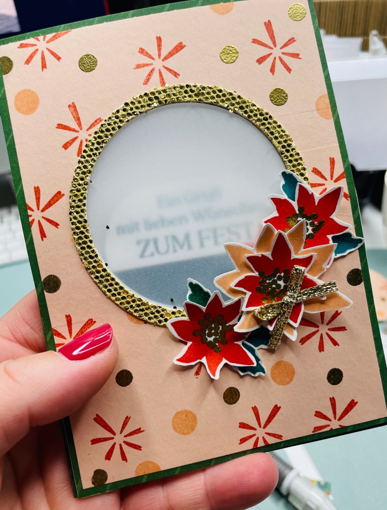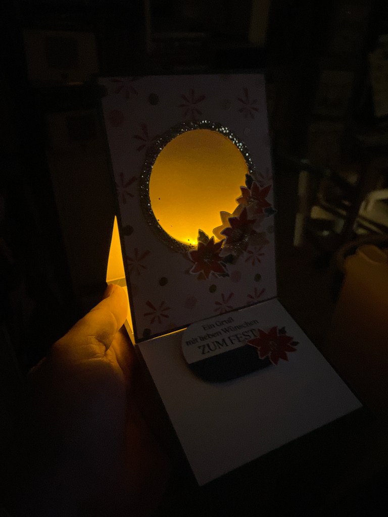 Und schön sieht die Easelkarte im dunkeln aus. Sie leuchtet richtig schön und ist aufgestellt wirklich ein schöner Hingucker in der Weihnachtszeit!