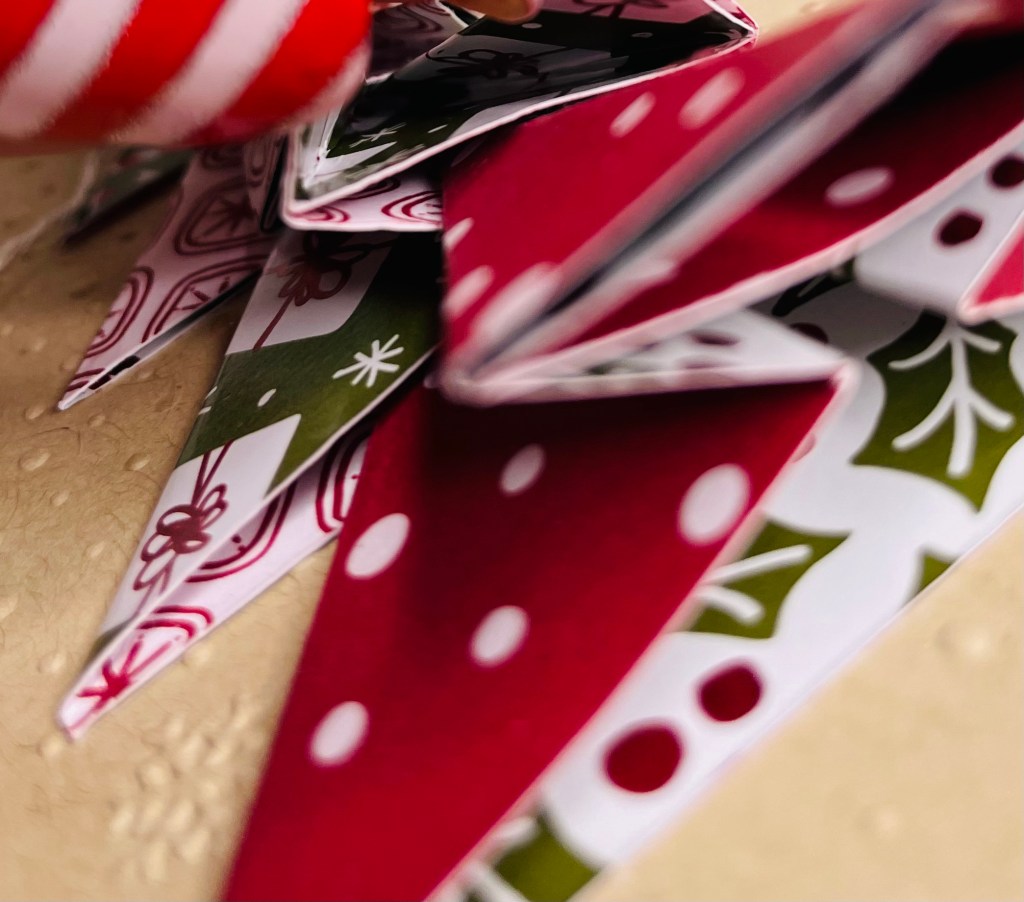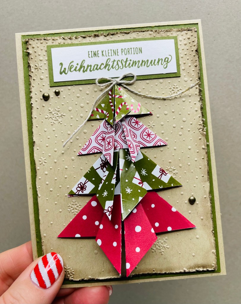 Und da habe ich diesen tollen Origami Tannenbaum entdeckt, wo man sehr gut DSP – Reste verwenden kann. ( Hier habe ich das „Glänzend Weihnachtlich“ genommen )