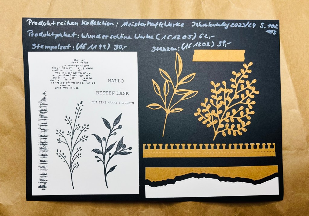 Hier habe ich für euch noch einmal mein abgestempeltes und ausgestanztes Produktpaket nebst Stanzen auf meinem Beispielblatt.