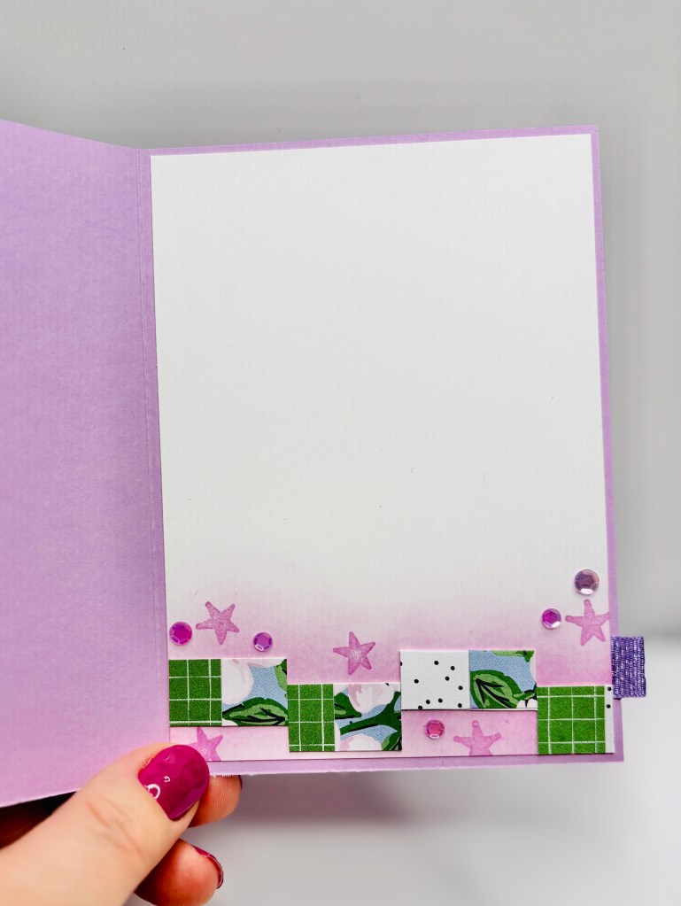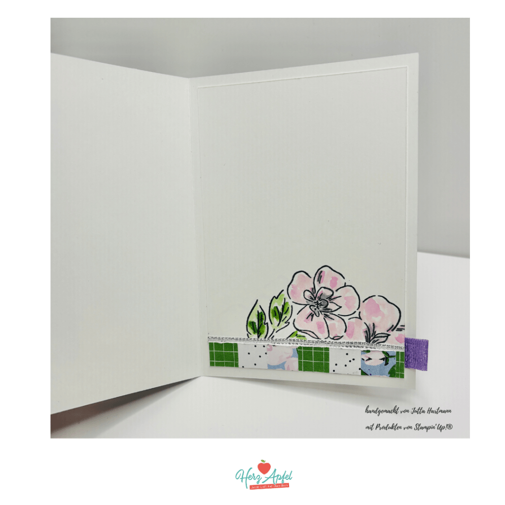 Ich finde jede Karte sollte auch von innen gestaltet werden. Erst dann ist die Karte auch perfekt für mich. Auch hier habe ich Reste verwertet. Die Blumen habe ich aquarelliert und mich am Stil des Designerpapiers gehalten.