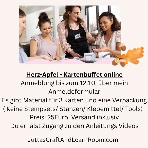 Das Herz-Apfel Kartenbuffet im Oktober bietet eine ideale Möglichkeit, den Herbst kreativ zu verbringen. Ob vor Ort oder online, du bist herzlich eingeladen, kreative Karten zu gestalten und eine entspannte Zeit zu genießen. Alsoüberlege nicht lange und melde dich noch heute an! Ich freue mich auf ein kreatives gemeinsames Erlebnis mit dir.
