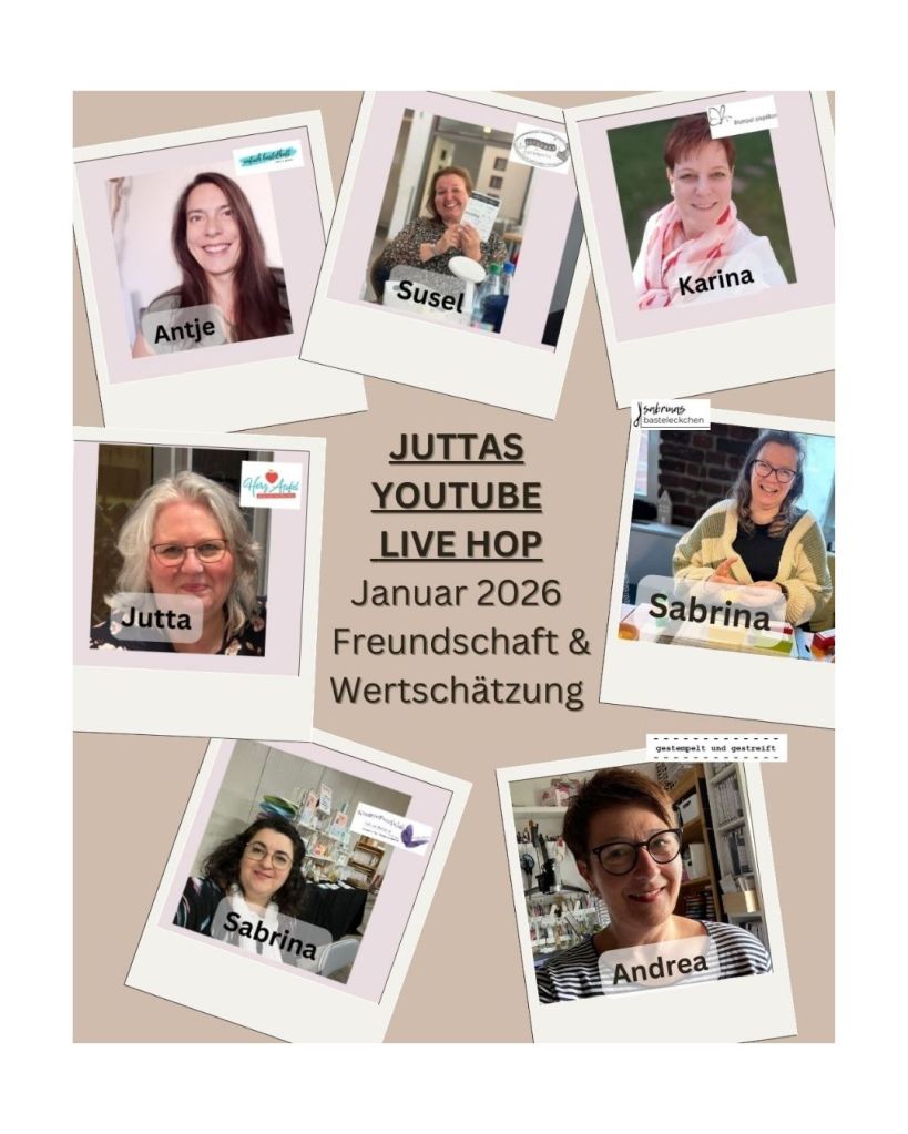 Im Januar ist es wieder soweit: Juttas YouTube Live Hop lädt zu einem ganz besonderen kreativen Event ein ✨. Unter dem liebevollen Thema „Freundschaft & Wertschätzung – Karten für Herzensmenschen“ habe ich mit meinem Gast Sabrina von Sabrinas Basteleckchen gemeinsam gebastelt, inspiriert und Herzensprojekte gestaltet.